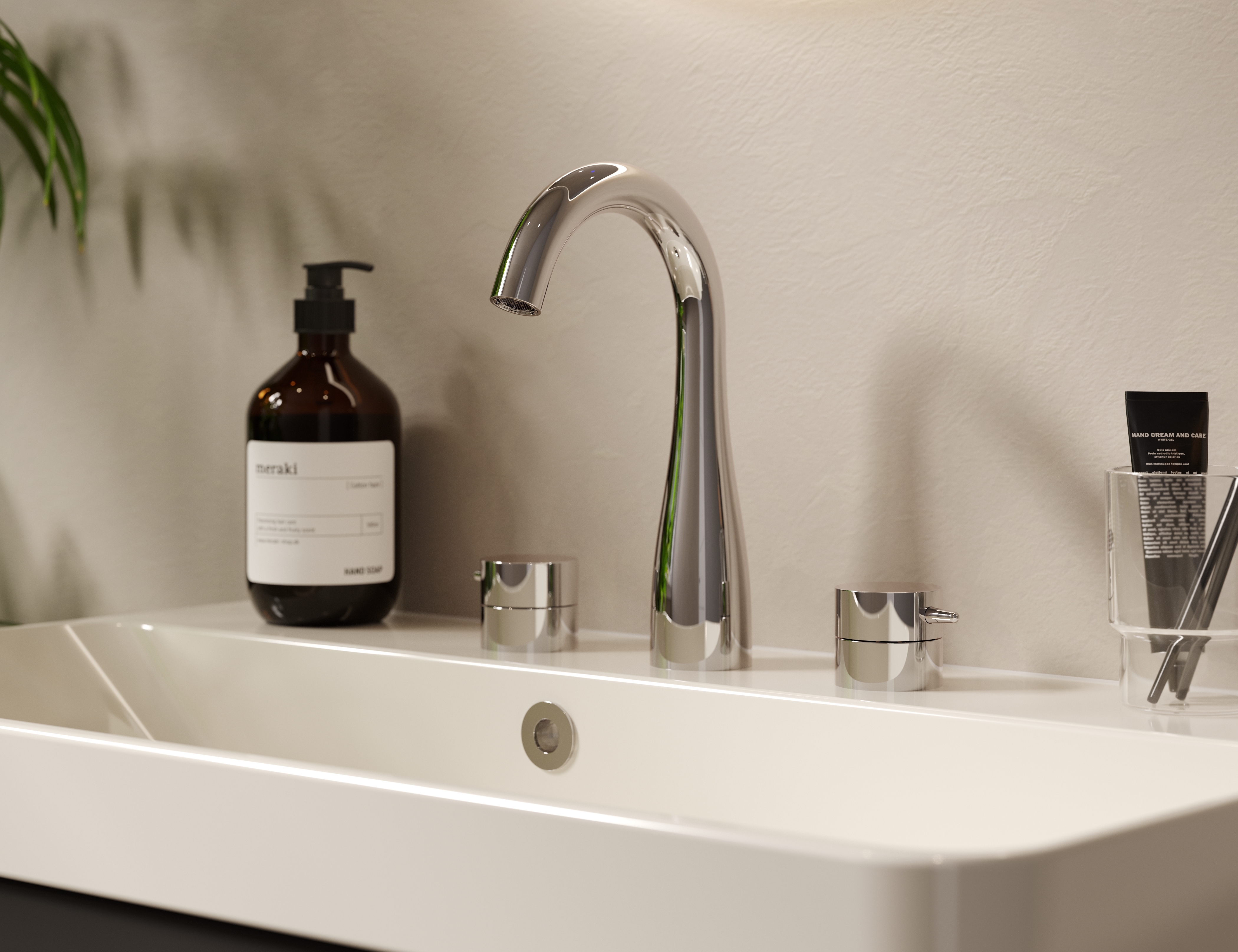 The 3 piece deck mounted basin mixer mimics the swan-line neck in the spout, and replicated to the small handle levers to create and all-encompassing sleek and sophisticated look.