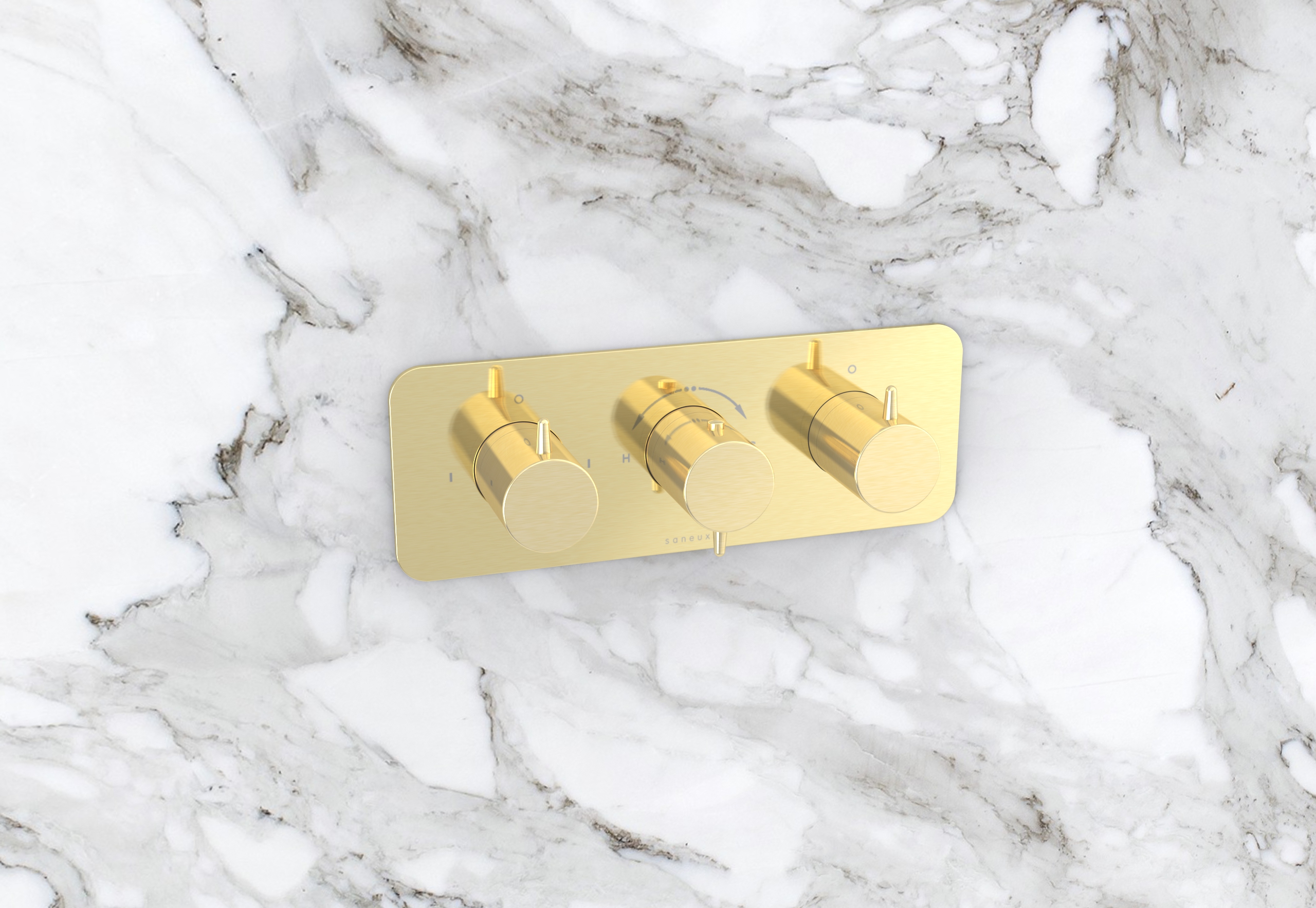 This landscape thermostatic valve has 3 outlets which allows it to control a shower head, handset and bath filler. The left and right handles control the on/off function of the components, whilst the middle handle controls the water temperature.