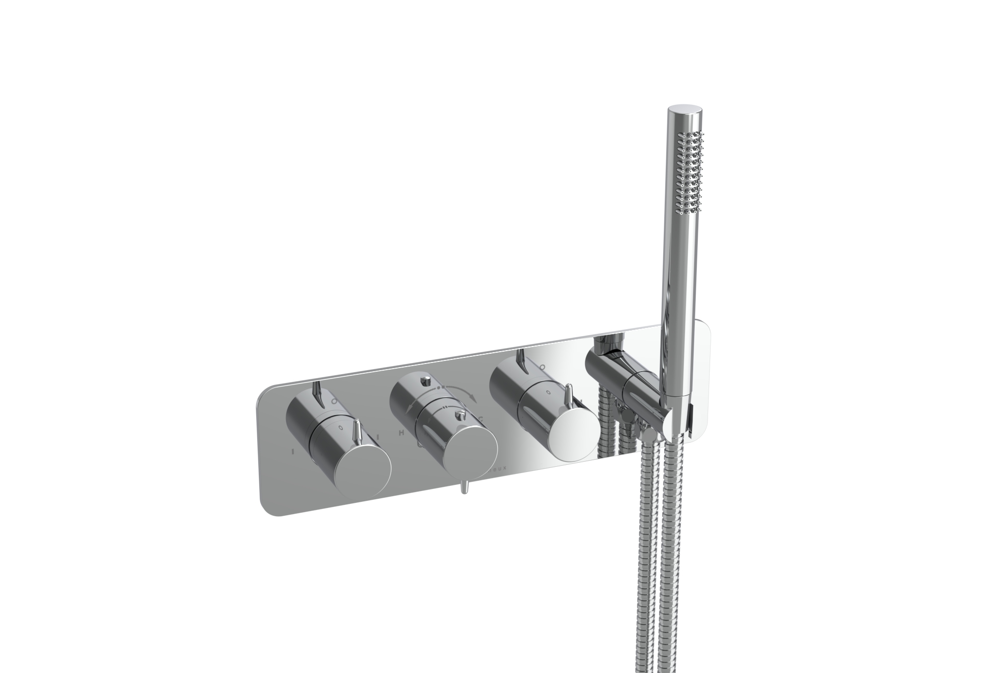 This landscape thermostatic valve has 3 outlets which allows it to control a shower head, handset and bath filler. The left and right handles control the on/off function of the components, whilst the middle handle controls the water temperature. This valve comes with a handset and holder creating a complete valve set up.