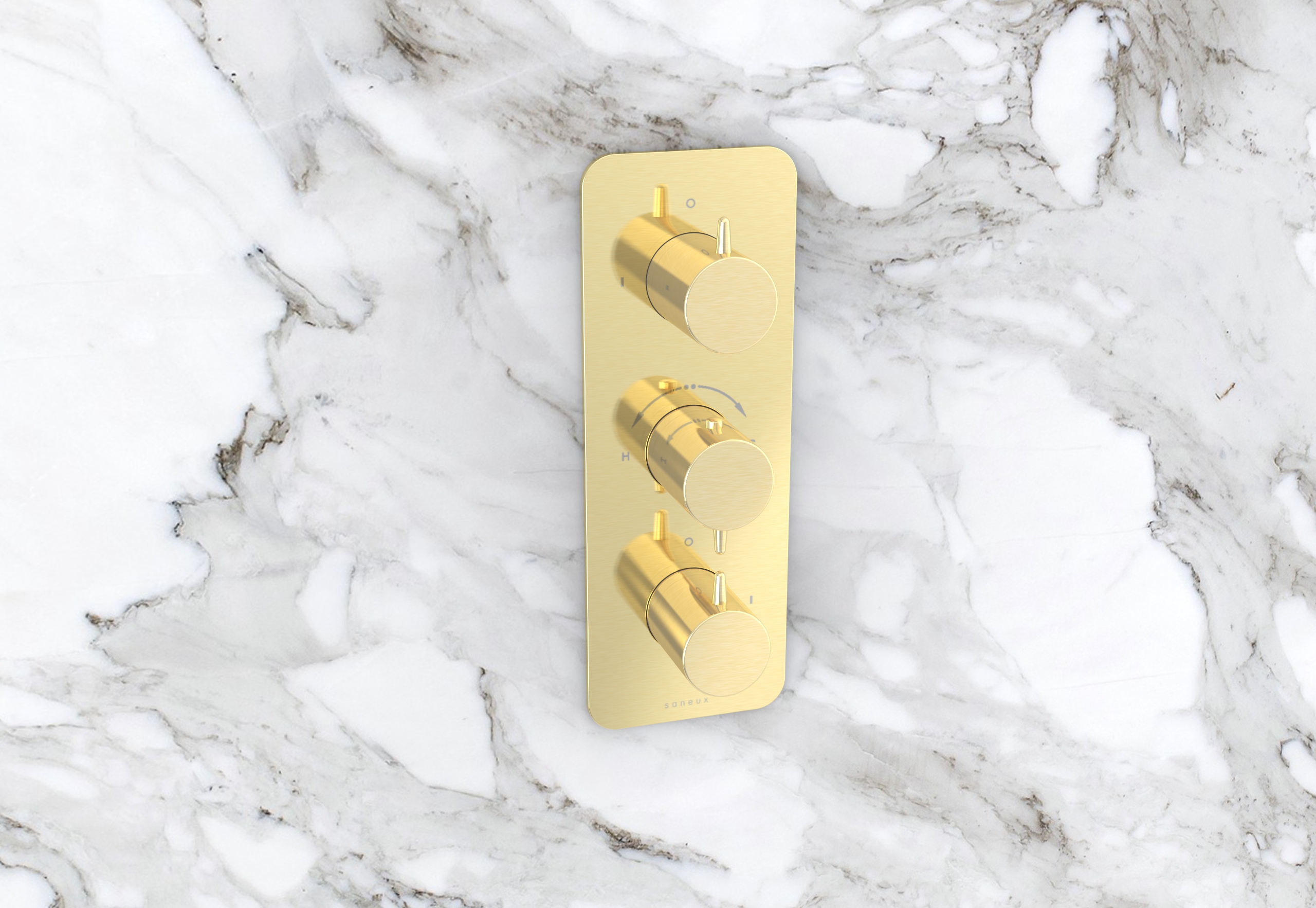 EDEN 3 way thermostatic shower valve kit in portrait - Brushed Brass
