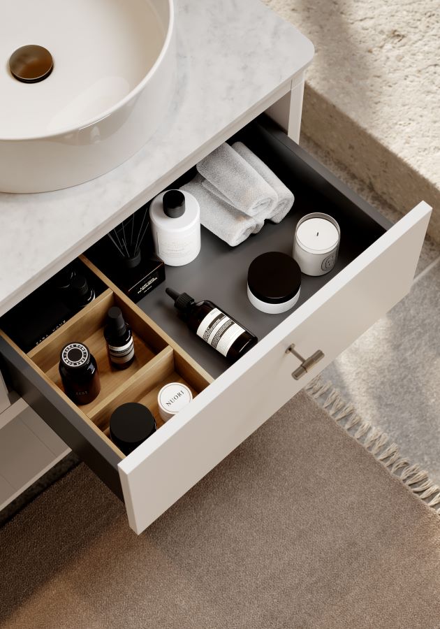 The 120cm unit, available in Matte White and Matte Fiord finishes, features clean textured lines that can blend with both modern and traditional styles. Frontier not only appeals to your sense of design but also caters to your organizational needs with its undermount tray and stylish beechwood drawer divider. Personalise your Frontier unit by choosing handles and sit-on basins from our SIENNA range that resonate with your unique style.