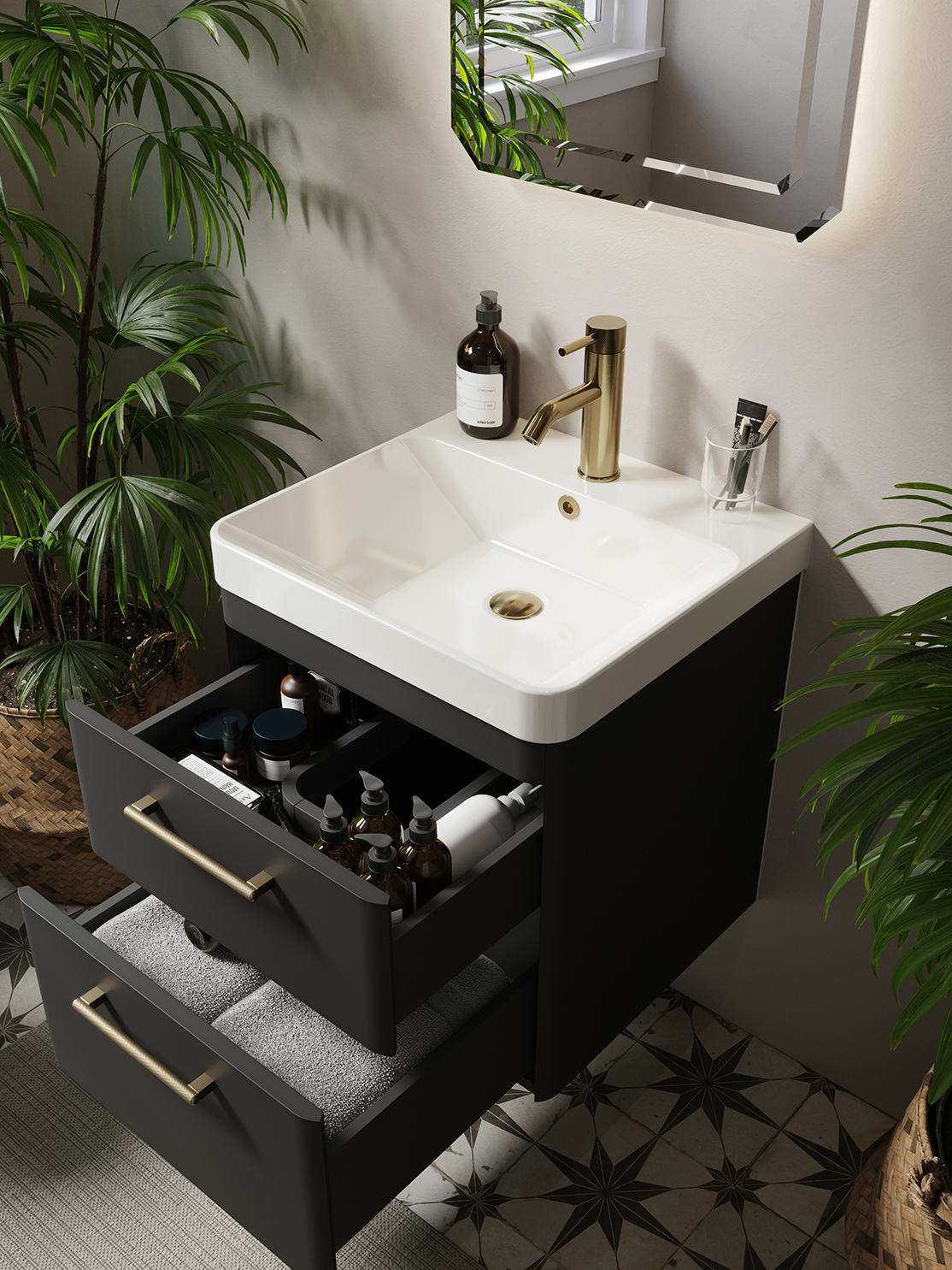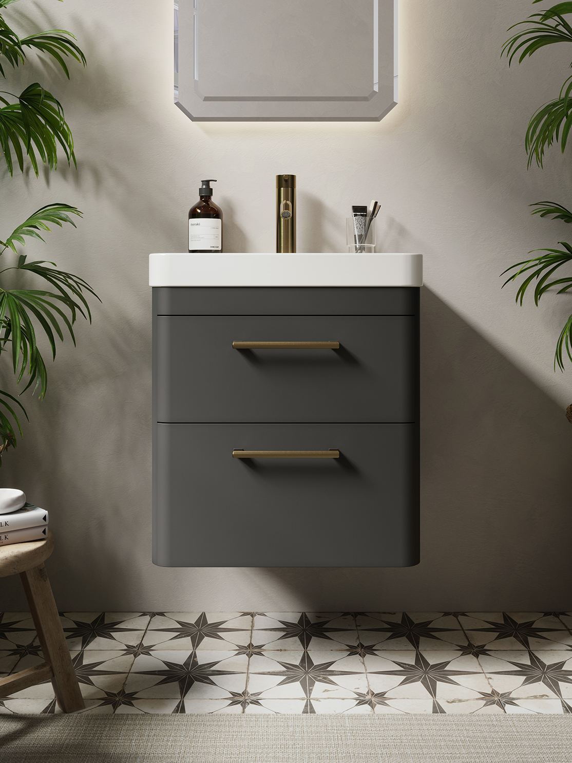 This 50cm 2 drawer wall mounted unit in matte anthracite provides you with practicality by offering plenty of storage space to keep your bathroom tidy, yet still having a modern and stylish look.