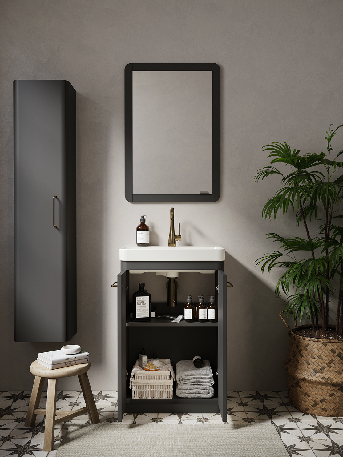 This 55cm 2 door floor standing unit has a projection of only 37cm, making it perfect for bathrooms & cloakrooms where space is scarce yet storage is essential. It has an integrated shelf, and the matte anthracite finish will add more depth to the space it's fitted in.