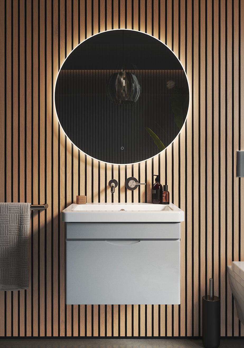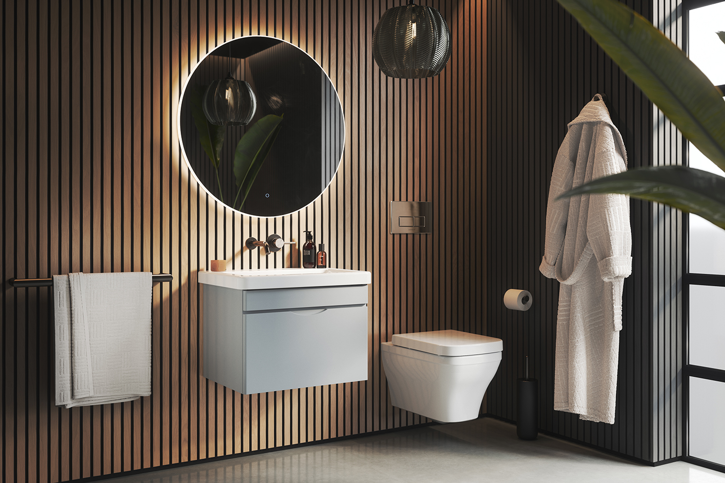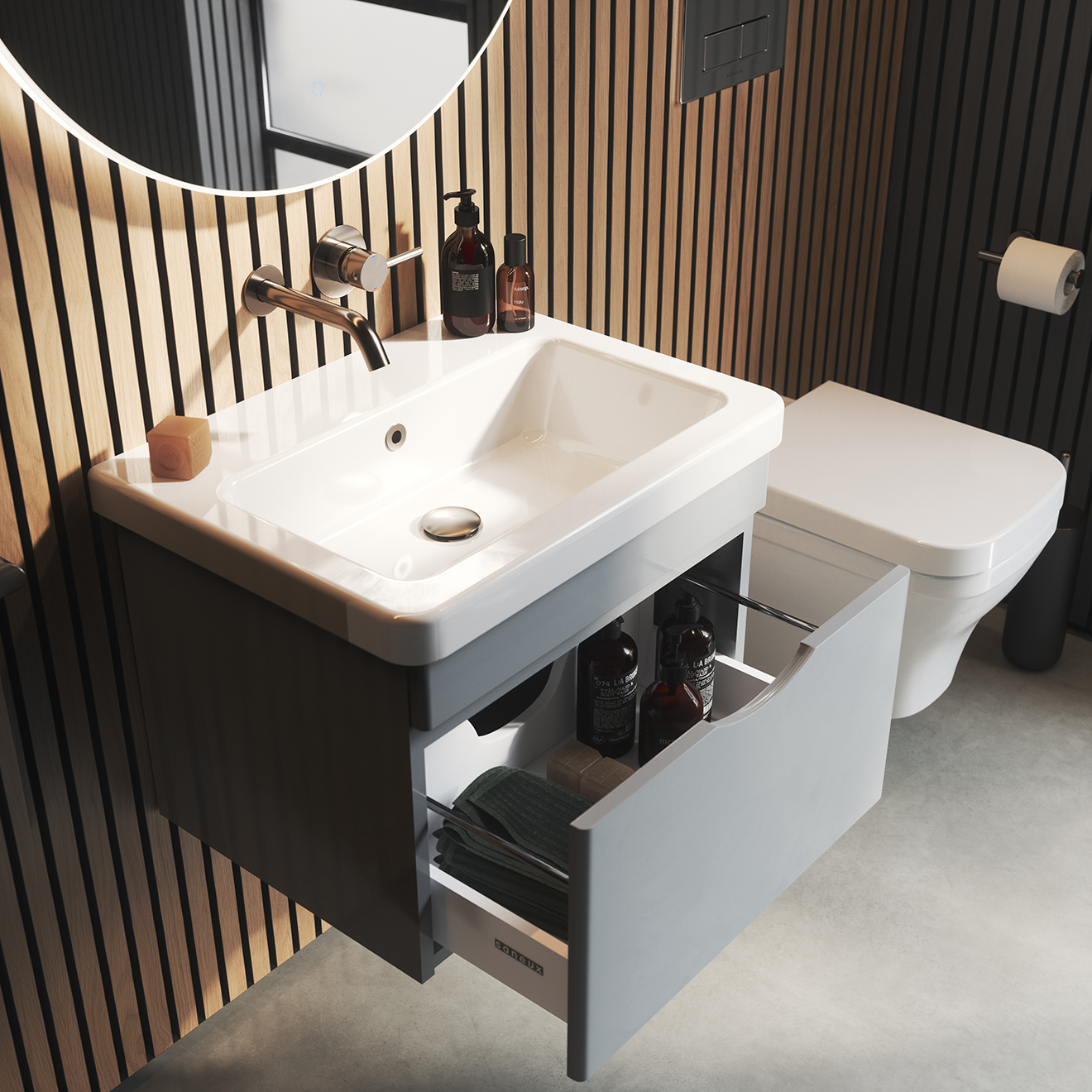 The INDIGO 60cm wall mounted unit has 1 soft closing handle-less drawer with deep space to hold your essentials, and is in a smooth matte dove grey finish.
