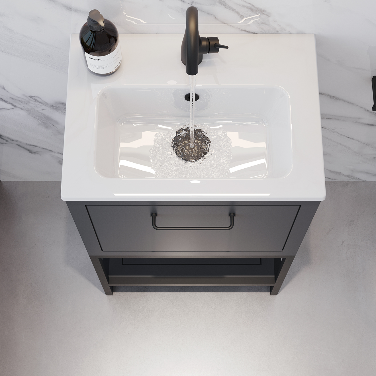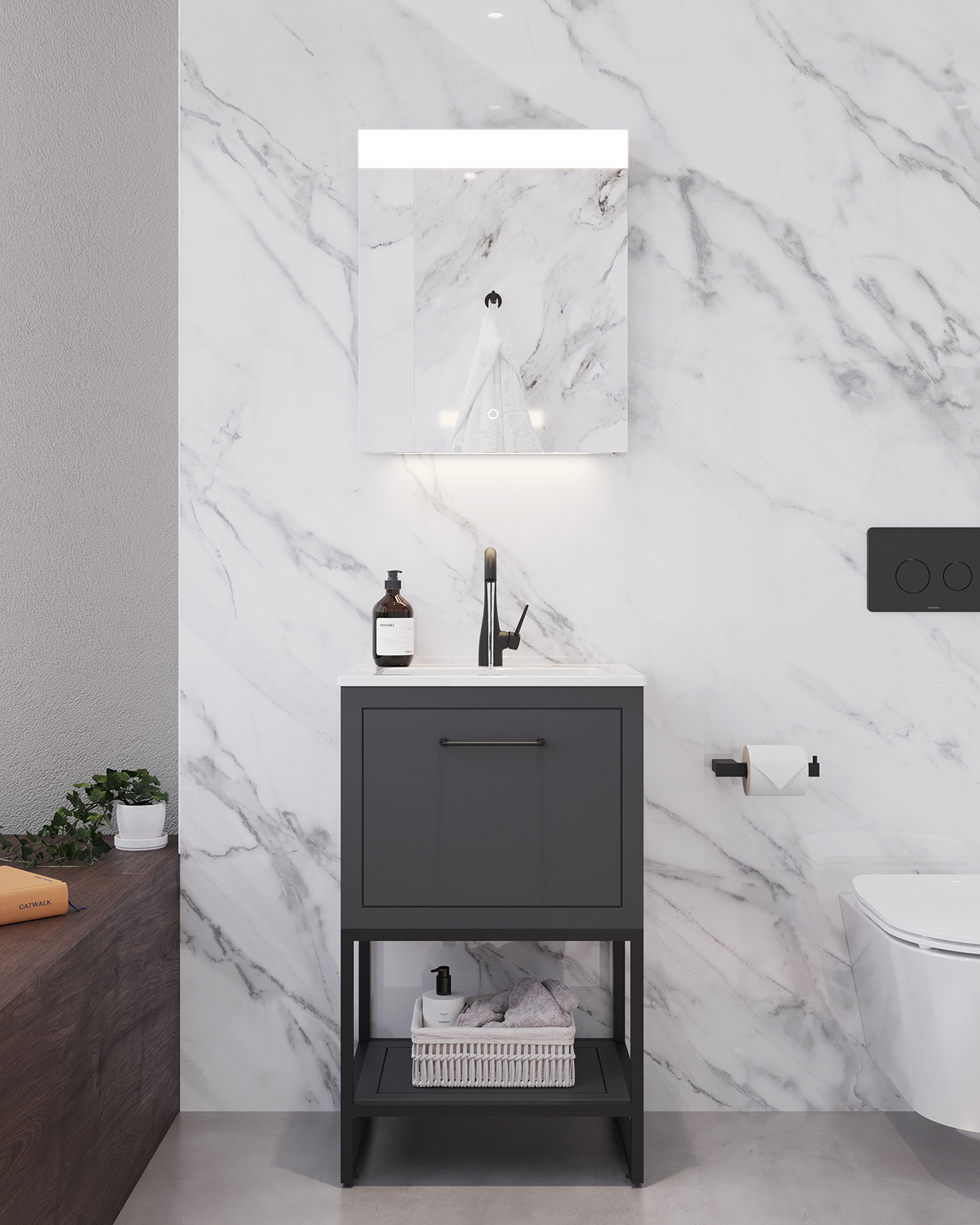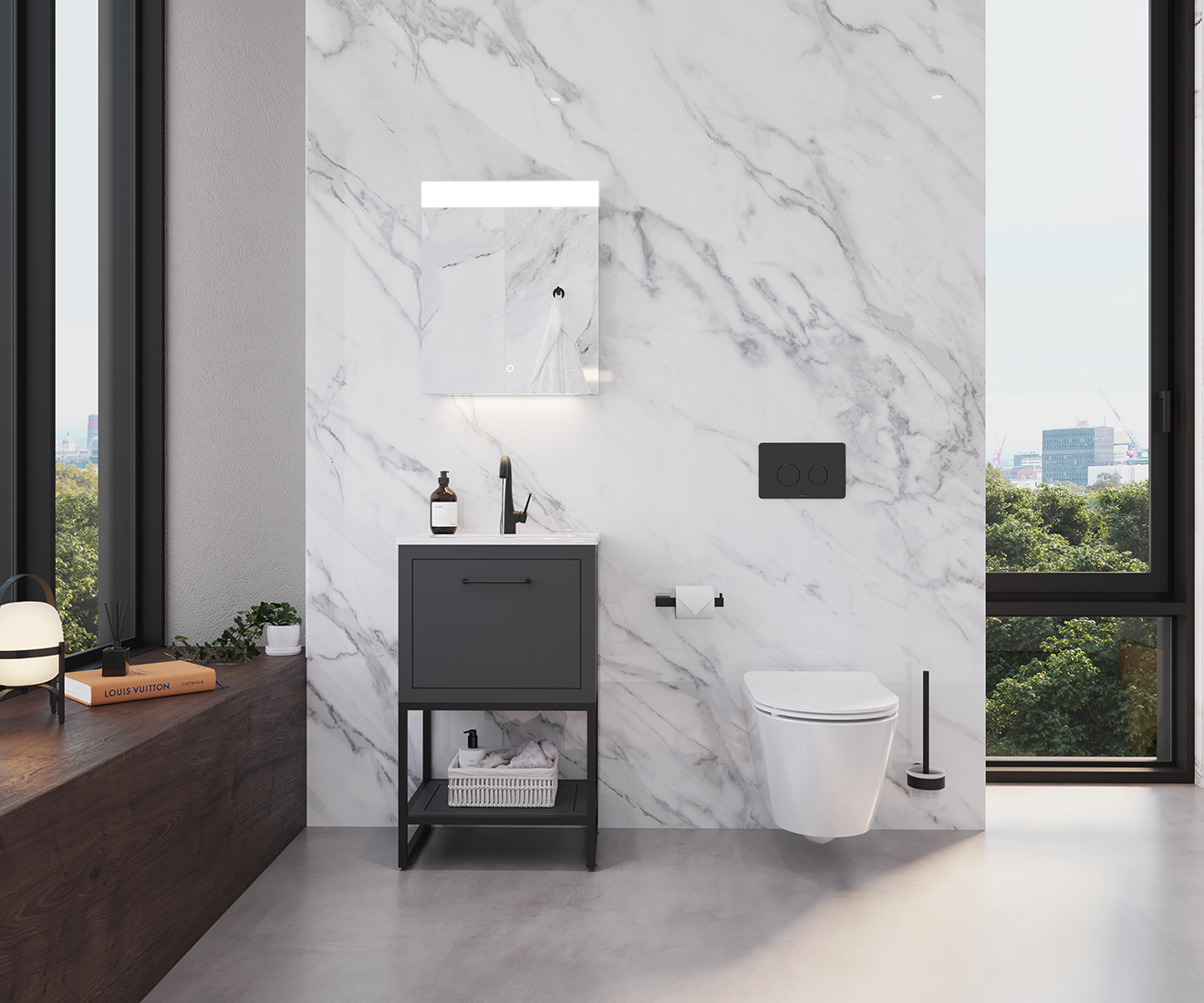 The ultimate trad-mod collection, KINGSBURY can suit all types of bathroom interiors. The classic design of the drawer fronts and integrated tray gives the traditional element, whilst the steel matte black frames gives a striking contrast against the matte finishes, creating a modern look.