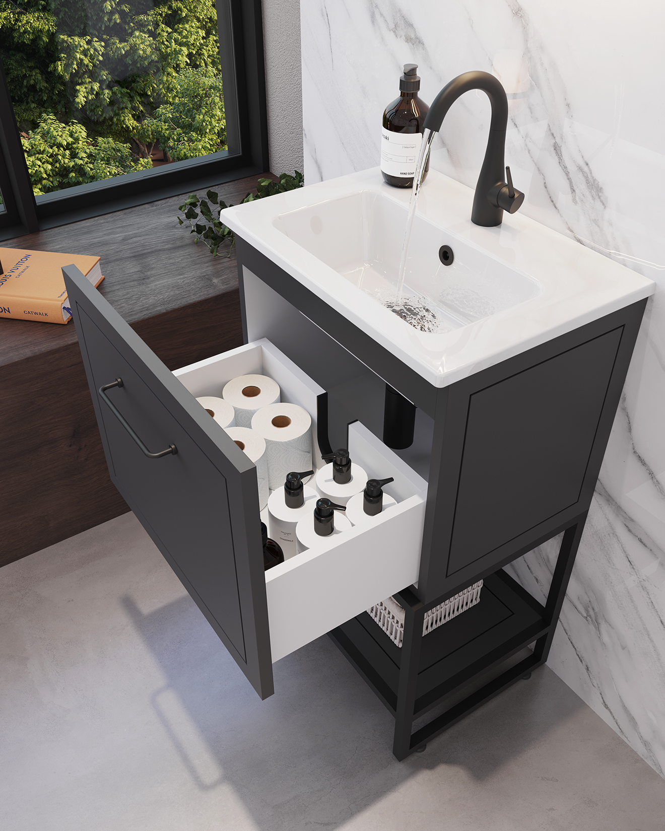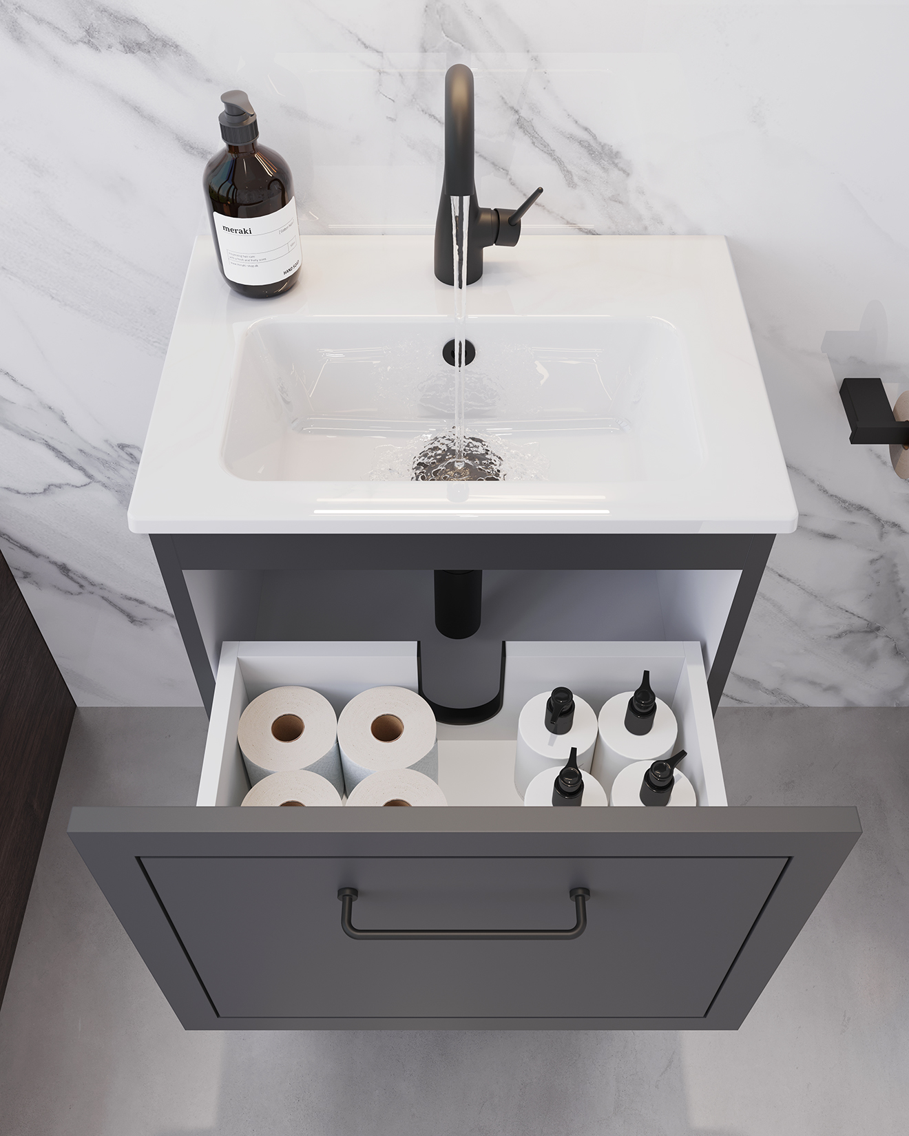 This 50cm 1 drawer floor standing unit in the dark matte anthracite finish provides plenty of storage space, a soft closing drawer, and a high-end look when paired with the slim, short projection UNI basin.