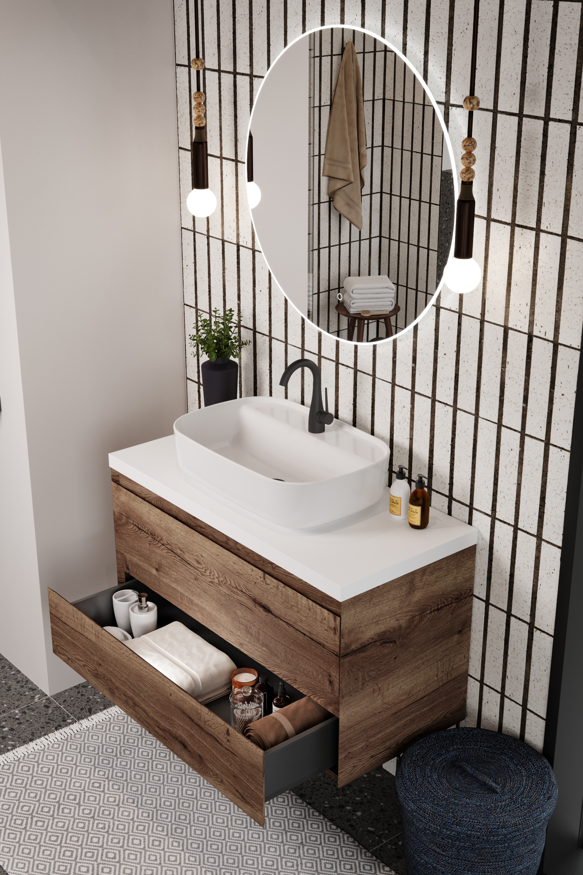 The 100cm 2 drawer wall mounted unit has plenty of storage space, and the finer detail of soft closing drawers prevents slamming. Opt for the English oak finish to bring a natural element into your bathroom, and pair it with either a UNI countertop or UNI 100cm slim profile basin.