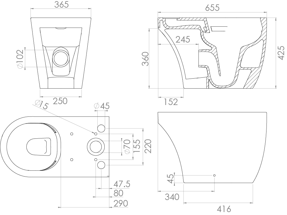 UNI close coupled open back WC pan - rimless